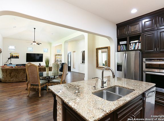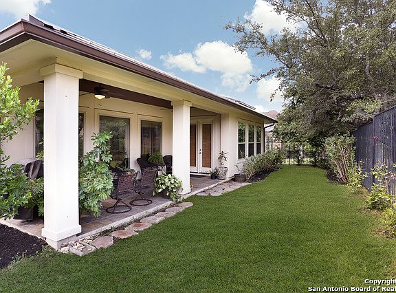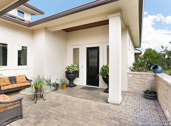 CUSTOM ONE STORY HOME IN ONE OF THE MOST EXCLUSIVE GATED COMMUNITIES IN SAN ANTONIO. OPEN FLOOR PLAN GREAT FOR ENTERTAINING FAMILY AND FRIENDS. ELEGANT ISLAND KITCHEN FEATURES GAS COOKING, ENERGY STAR S/S APPLIANCES WITH PLENTY OF CUSTOM CABINET SPACE AND OVERSIZED ISLAND. THE DINING AREA OVERLOOKS PROFESSIONALLY LANDSCAPED BACKYARD AND CAN BE A SUNROOM/STUDY DEPENDING ON OWNERS NEEDS. THE MASTER BEDROOM FEATURES PLENTY OF NATURAL LIGHT WITH ELEGANT SPA LIKE MASTER BATHROOM INCLUDING HUGE WALK IN CALIFORNIA CLOSET. OVERSIZED COVERED PATIO, WET BAR AND BUTLERS PANTRY. MINUTES FROM IH 10, LA CANTERA, THE RIM & NISD SCHOOLS.