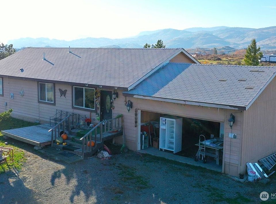 360 degree Tiffany and Omak Mt views. Omak flats county living - 3 bedroom, 1.75 bath home on 3.35 acres. 1,372 sq ft of living space plus 400 sq ft attached garage. Layout includes living room, dining room with French doors to backyard, kitchen with breakfast bar, and separate laundry room. Primary bedroom features en-suite bath. Property offers garden area, fire pit, and open usable ground. Finished shed with power provides additional storage or workspace. Quiet rural setting with room for hobbies, small livestock, or expansion. Easy access to local amenities. Home does need updates, but priced accordingly.