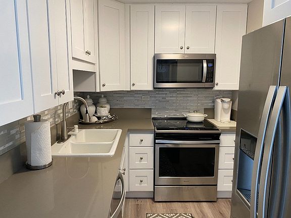 Refreshed and remodeled center unit right off of the stairwell entry way. The entire unit has been modernized as you enter the condo to kitchen that has been redone for the cook in you to entertain guests or a quiet evening for yourself. Full size refrigerator, electric range with stove and microwave oven mounted are included. Durable laminate flooring featured throughout the unit. 608 sqft of living space make this unit a comfortable 1/1 with lots of storage. The association dues go $540.00 on January 1, 2023. Secure, coin operated laundry facilities as well as trash facilities for residents, is located at the ground level. Direct mail service and individual electric meters for all units, also at ground level. The building has recently been repainted and re-roofed. Well maintained and managed by Day-Lum Property Management.