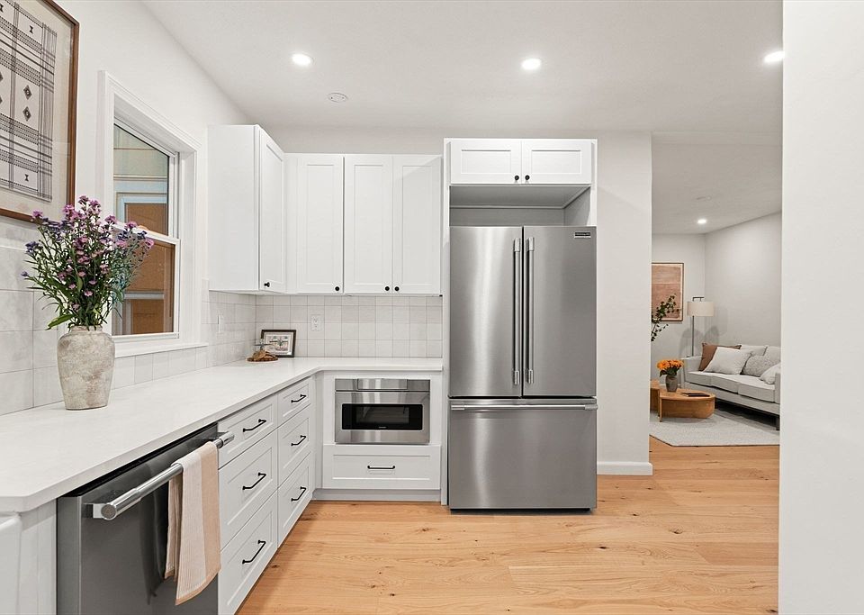 Stunning first floor 2 bed, 1 bath condo tucked away on a side street in JP checks all the boxes! Located just minutes to the Arboretum, Centre / South St. shops, Forest Hills station & Jamaica Pond, this stylish home is filled with thoughtful, luxurious touches. Mid-century modern vibes blend many cosmetic updates such as new wide plank European oak flooring, high-end fixtures, central air, and recessed lighting. The open layout and high ceilings showcase the gorgeous kitchen and its Frigidaire professional appliances, tiled backsplash, and custom hood fan. The posh bathroom features Moen shower / tub system, polished nickel fixtures and floating vanity. Additionally, there’s LG in-unit laundry, a large entry foyer, private patio, walkout basement ideal for bikes / kayaks, + large private storage room. This was a 2015 full reno & 2025 refresh and is a new condo conversion offering 2 units. Don’t miss this exceptional home!
