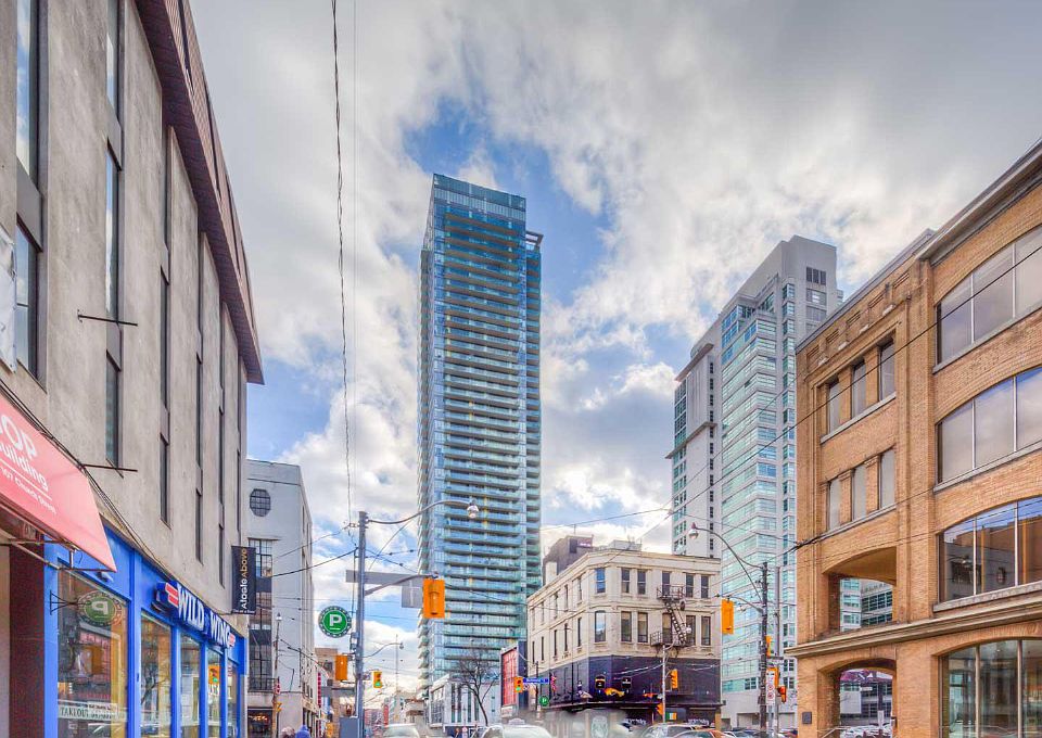 Stunning views: The glass exterior of Spire condos reflects the sky, the beautiful gothic Cathedral Church of St. James and the parks around the building. Almost every room and all those balconies offer breathtaking bird's eye views of our beautiful city.