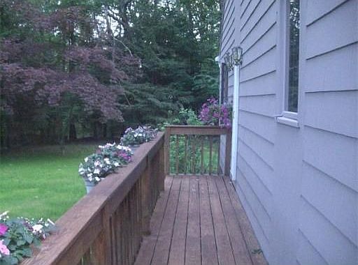 Contemporary nestled on a wooded acre (.9) provides both privacy and great highway access. Open floor plan with cathedral ceiling in DR/LR. 2-3 bedrooms with beamed ceilings. Two full baths. Eat in kitchen opens to LARGE 22 x 25 foot deck over the 2 car garage...great for summer entertaining. Partially finished family room in basement. Large workshop (originally a one car garage).