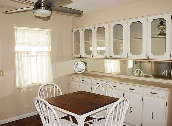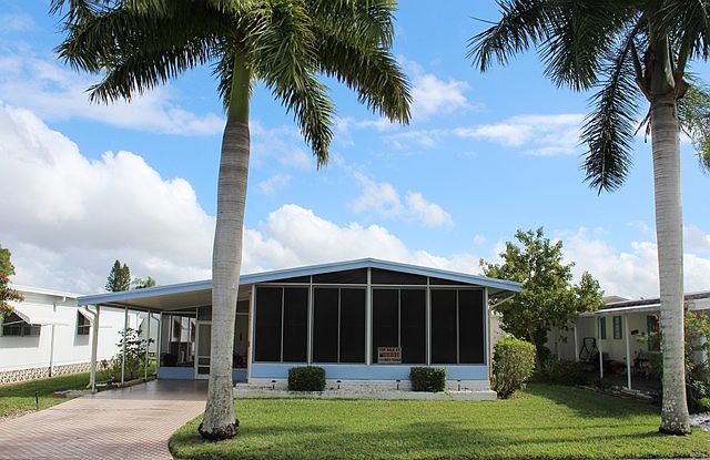 Listed by the OFFICIAL SALES OFFICE of this community. This tropical paradise includes traditional queen palm trees and a bright, cheery home with wood finish laminate flooring throughout. The sunny living room has access to the front lanai with tinted vinyl windows. Spacious kitchen with white cabinets & appliances, tile back splash, pantry and a bay window facing the front lanai which also provides natural light to the dining room with built-in china hutch and updated ceiling fan/light. The master bedroom contains another bay window, large walk-in closet and convenient vanity separate from the shower room. Screened lanai under the carport leads to the oversized bright storage shed with clothes washer, dryer and utility sink. Newer electrical panel. Nice landscaping with large queen palms. Convenient location, just down the street from the Pioneer Plaza picnic area and clubhouse. Roof over. Partially furnished. This home is in a very active, 55+ community with many clubs, sports and activities for the residents. Amenities include two swimming pools, three clubhouses, hot tub, sauna, state-of-the-art fitness center, library, billiard room, shuffle board, tennis courts and pickle ball courts. HOA fee includes: site lease, water/sewer, trash/recycle, lawn mowing, basic cable, 24 hour attended gatehouse and access to all community amenities.