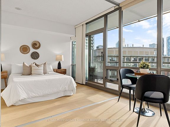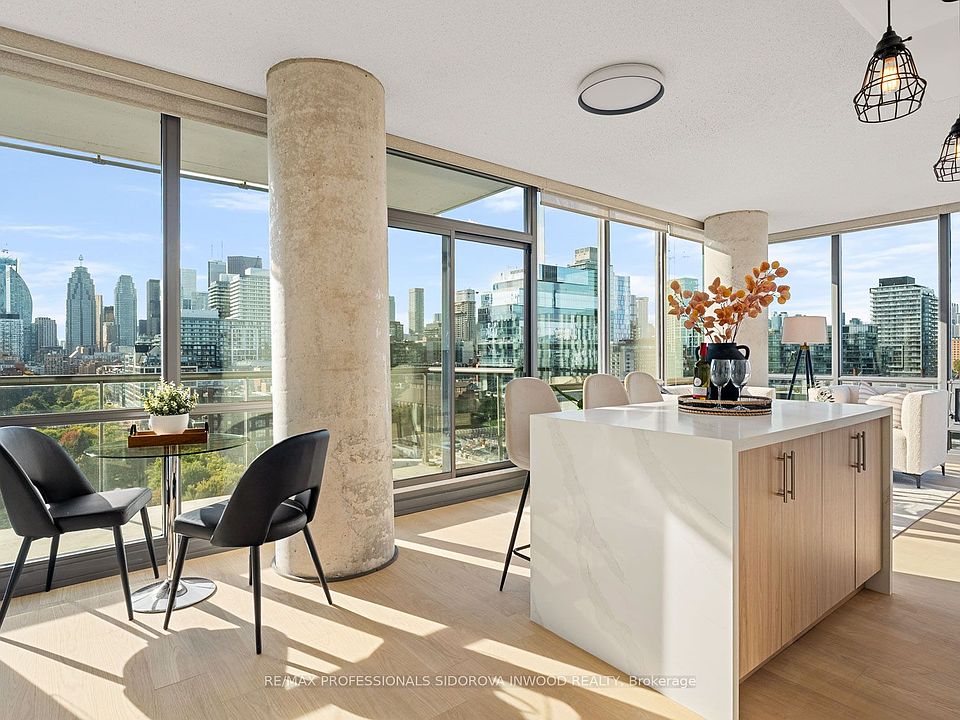 Spacious and beautifully upgraded, this is one of the most sought-after suites in the Distillery District, offering a rare combination of luxury, layout, and location. Enjoy stunning north-west views of the Toronto skyline and CN Tower from the oversized balcony and sun-filled living space. The living and dining areas flow seamlessly and are perfect for entertaining, with a brand new kitchen island, quartz countertops and backsplash, new cabinet doors, and brand new engineered hardwood flooring throughout.The peaceful primary bedroom features a clear city view, ample storage, and a private ensuite. The second bedroom/den with sliding glass doors is ideal as a guest room or stylish home office. Additional upgrades include custom UVB roller blinds and upgraded closet doors throughout.Includes parking and locker for added convenience.Located in the heart of the vibrant Distillery District just steps from some of the city's best restaurants, galleries, shops, and the famous Christmas Market. Enjoy the culture, charm, and community of this historic neighbourhood, with easy access to the lakefront, downtown core, and TTC.The building offers top-tier amenities including a rooftop outdoor pool and lounge, fully equipped gym, party room, billiards room, guest suites, and more.Whether you're sipping craft beer, exploring local art, or soaking in skyline views, this unit offers a complete downtown lifestyle in one of Torontos most iconic communities. Don't miss your chance to own a piece of the Distillery District!