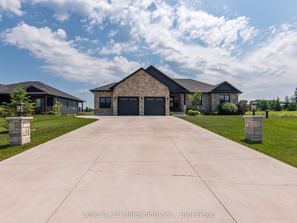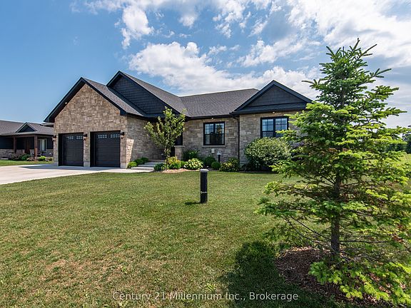 Some homes check a few boxes, this one checks them all. With over 4,000 sq ft of finished living space across the main floor and lower level, this custom-built bungalow offers a level of space and flexibility rarely found. Ideal for families who want room to live, work, entertain, and grow. Set in Allenford's sought-after Nickason Drive subdivision, it blends a peaceful country feel with unbeatable central convenience. Just 15 mins to Southampton, 20 to Owen Sound & Port Elgin, 40 to Bruce Power. Curb appeal stands out with full Shouldice stone exterior, stamped concrete porch, triple-wide driveway, modern entry and oversized 2.5-car garage. Inside, the open-concept layout is refined and functional. The kitchen is a showpiece with quartz counters, contrasting white and white oak cabinetry, brick-style backsplash, black stainless appliances and farmhouse sink overlooking the yard. A walk-in butler's pantry adds bonus storage and prep space, with a stylish 2-pc bath tucked nearby. The living room features a propane fireplace with stone surround, custom built-ins and glass doors to the backyard. The primary suite offers a spa style ensuite and walk-in closet with laundry nearby. Two additional bedrooms share a beautifully finished 4-pc bath.The fully finished lower level impresses with 9-ft ceilings, in-floor heat, custom media wall and space for a golf simulator, gym or play zone, plus a 4th bedroom, office/guest room and designer 3-pc bath. Outside, relax on the covered 16' x 8' patio or soak in the hot tub under the gazebo. The fenced yard backs on to open space for privacy and peaceful views.A rare, best-of-the-best offering - homes like this don't come along often.