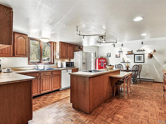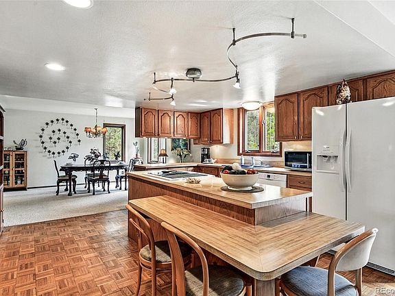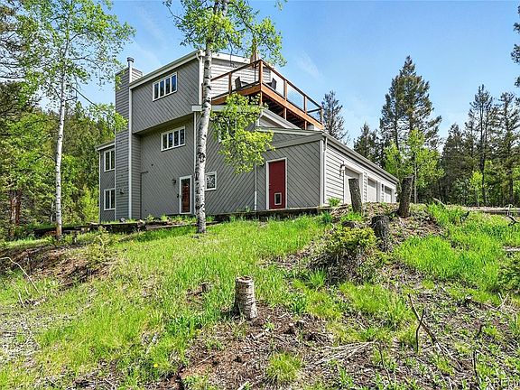 This extraordinary mountain home in the prestigious Woodside Park community offers the perfect blend of rugged Rocky Mountain beauty and modern comfort. Surrounded by towering pines and located on a quiet cul-de-sac with only six other homes, it provides unmatched privacy and serenity. Inside, the main living area is anchored by a cozy fireplace and filled with natural light, creating a warm and welcoming atmosphere. The adjacent dining room is perfect for family dinners or entertaining guests. The expansive kitchen features abundant cabinetry, ample counter space, a large walk-in pantry, and a spacious eat-in area—ideal for casual meals or morning coffee. A main floor laundry room adds convenience, while the oversized three-car garage offers plenty of room for vehicles, tools, bikes, and gear—perfect for Colorado mountain living. Upstairs, soaring vaulted ceilings enhance the open loft-style family room, ideal for movie nights, a second lounge, or play area. A full bathroom and dedicated office space make remote work or home projects a breeze. Generous windows frame breathtaking views of Lion’s Head Mountain, Mount Blue Sky, and Rosalie Peak. All bedrooms are comfortably sized with ample closet space. The third-floor primary suite is a private retreat with its own deck. A true showstopper and your front-row seat to sunrises, stargazing, and the sweeping views of the Colorado Rockies. Picture your morning coffee with a view for the rest of your life! Fire mitigation for this home is complete-it meets the requirements of State Farm Insurance. Staunton State Park is 3.3 miles down the road, and Kenosha Pass is a scenic 30-minute drive. For winter sports lovers, Breckenridge Ski Resort is only 90 minutes away, not to mention this home is just five minutes from Hwy 285 and 35 minutes from Denver. Nearby conveniences include shops, restaurants, a gym, and more in Pine Junction and Conifer. Your mountain retreat with majestic views awaits! Welcome HOME!