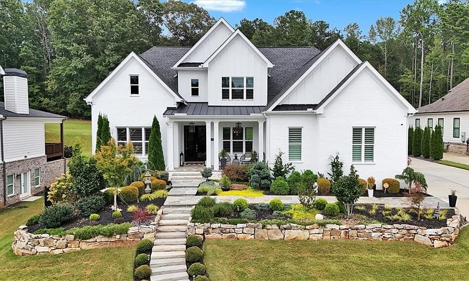Welcome to 33 Nuttail Lane, located in Powder Springs, in the prestigious Harrison High School district. A custom masterpiece built in 2021 sits on 1.27 acres of luscious colorful landscaped grounds with extensive custom lighting for day and night. This luxury home has 4 bedroom and 3 and a half baths with a serene primary suite on the main level with access to the covered back porch and heated saltwater pool. The additional 3 bedrooms are upstairs, all with spacious walk in custom closets, and featuring a grand flex media room perfect for family movie nights or teen hangouts. As you enter the home from the custom rock walkway through the rocking chair front porch you enter into the two story foyer. Your eyes are immediately drawn to the grand openness and the 10 ft ceilings with 8 ft solid wood doors. Upon entry there is a spacious office area to your left and the dining room to your right that has a separate dry bar area with its own ice maker and wine cooler. The gourmet kitchen is open to the family room featuring a unique and stylish fireplace flanked by shelving and custom cabinets. The kitchen and family room has a wall of windows allowing for rich natural nighting, and an unobstructed view of the covered back porch, heated saltwater pool, jacuzzi, and covered outdoor kitchen, all of which are perfect for entertaining friends and guests. Beyond the pool is another half acre of natural landscapes with a fire pit and gazebo allowing generous space for peace and relaxation. This home has a 3 car garage, an extra large parking pad, and sits on a full unfinished daylight basement ready for future expansion. 33 Nuttail Lane shows how beautifully comfort and luxury can be. Step inside to experience a home where every detail is designed to delight. Schedule your showing today!