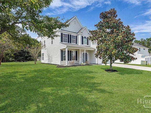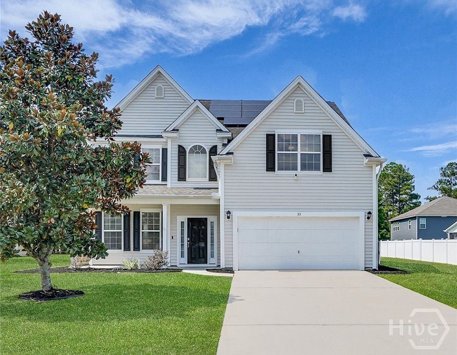 Welcome to your private retreat in a gated community! This 5-bedroom, 3-bath home sits on over half an acre, backing up to serene wooded views. Thoughtfully designed for today’s lifestyle, it features a versatile flex room, an open kitchen with stainless steel appliances and breakfast nook, and a spacious living area perfect for gatherings. The owner’s suite is a true escape with double vanities, soaking tub, separate shower, and water closet. Energy-efficient solar panels keep monthly power bills impressively low, averaging around $100. Outside, enjoy a large yard with plenty of space plus a storage shed for all your extras. Residents enjoy resort style amenities including a clubhouse, fitness center, pool, playground, and lake. Located just minutes from Pooler’s hottest amenities with easy interstate access for a quick drive in to downtown Savannah!