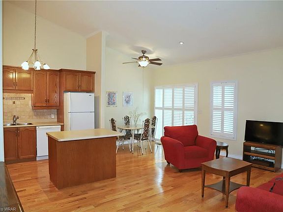 Are the stairs getting to be too much? Looking for a sense of community or a place where you can lock the door and fly south for the winter? This low-maintenance end unit bungalow townhome with a garage is the answer. The home features an open concept kitchen/dinette/living room with hardwood floors, California shutters, kitchen island, sliders to a private deck and 14' ceilings. The primary bedroom has a full ensuite and there's a walk-in shower in the 2nd bathroom. Five appliances come with it including main floor laundry for your convenience. The 2nd bedroom can be a den and there's a rec room to watch TV. Other features include 9' ceilings, a cold cellar and plenty of storage. Enjoy coffee and a chat with neighbours and friends on your inviting front porch. All this close to trails, parks and shopping including No Frills and Shoppers Drug Mart. The monthly fees of $195.00 offer great value and include grass cutting, snow removal, common area maintenance and insurance.