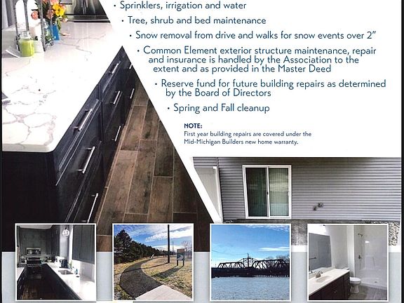 Crafted by Mid-Michigan Builders, Iron Bridge at Wheeler’s Landing is Designed for Waterfront Living Welcome to Iron Bridge at Wheeler’s Landing — Bay County’s premier new Saginaw River waterfront condominium community, thoughtfully designed for comfort, quality, and convenience. Featuring modern single and two-story duplex-style condos, this vibrant neighborhood offers the perfect blend of luxury riverfront living and easy access to everything the Great Lakes Bay Region has to offer. Located just minutes from I-75, Iron Bridge puts you close to shopping, dining, healthcare, and recreation — while the Saginaw River, Wheeler Landing Yacht Harbor, and the scenic Riverwalk/Rail Trail Loop are right outside your door. Designed for those who value simplicity, style, and low-maintenance living, Iron Bridge Condominiums make it easy to “lock and leave” while enjoying the full benefits of homeownership. Whether you’re starting fresh, downsizing, or ready for a more carefree lifestyle, this community offers the freedom to live beautifully — without the burden of maintenance. Choose from single-story or two-story homes, with optional basements, walk-out lower levels, and fully accessible zero-threshold floor plans available. Each home is fully customizable — work with our design team to select your ideal layout, finishes, and fixtures. Home Features & Options Include: • 2 to 4 bedrooms • Basement, crawl space, or slab foundation • Second-floor decks and walk-out basements • Custom kitchen, bath, and dining layouts • 1,200 to 2,000 sq. ft. floor plans ?? Saginaw River Waterfront Condos — Pricing Starts at $649,900 Offering the best price for new construction waterfront condos in Bay County, Iron Bridge at Wheeler’s Landing delivers exceptional value without compromise. Nestled between the waterfront and Defoe Park, Iron Bridge at Wheeler’s Landing is more than a place to live — it’s a new way of living well. A new home. A new lifestyle. A better way to live.