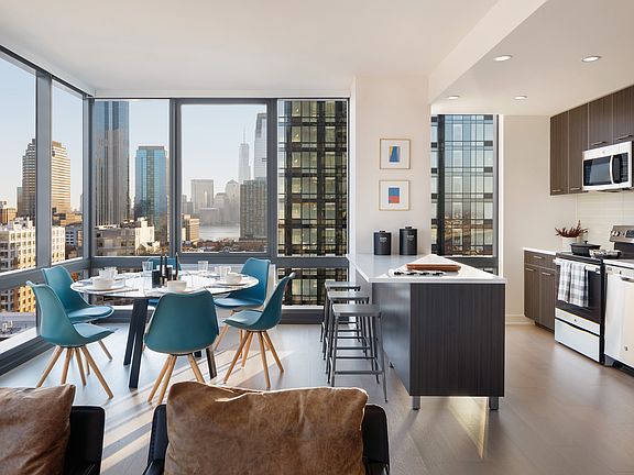 Enjoy the vantage point of Manhattan and the Statue of Liberty from our 45th-floor sky lounge. Find your city oasis in our social, fitness and entertainment spaces that extend out to the zero-entry pool complete with fountains and a waterfall. Hang out with friends around our fire pits or with your four-legged friend at our dog run. A short distance to Grove Street PATH or Light Rail to find your new favorite bistros, museums and beer gardens in historic Paulus Hook. And of course, there's nothing quite like a lazy Sunday spent at home with your floor-to-ceiling windows and 9-foot ceilings.