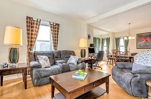 Move-right-in condition neighborhood Colonial with nearby public transportation, schools, downtown, parks and more! Bright open kitchen with the recipe for success: Everything within reach, great cabinet space, granite, stainless steel appliances & large dining area with updated tile floor. Bay windows provide a bright dining room with hardwoods perfect for get-togethers with friends, opens to generous sized living room all with soaring high ceilings. Upstairs 3 bedrooms and full tiled bath PLUS bonus 3rd level with hardwood floors ready for your finishing touches. Front farmers porch and recently updated PRIVATE fenced in back yard (one of the largest in the neighborhood) perfect for poochie to run and spring time fun! Recent furnace (1.5 years old), still young central A/C, interior paint and flooring. Won't last, offers reviewed Tuesday 4/3 after offer deadline at noon.