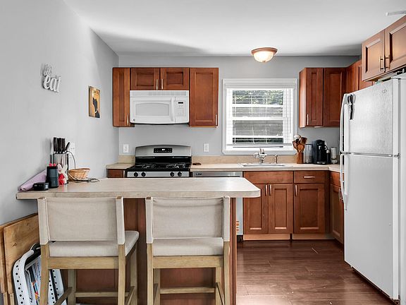 Eat-in kitchenShared backyardIn-unit laundryComfortable spaceBreakfast barCeramic tile flooringWood shaker cabinets