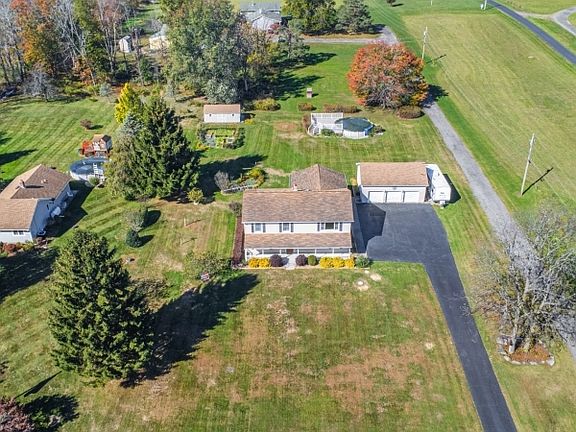 Privacy, views, and move-in ready convenience await! Nestled on a peaceful dead-end street, this expansive 4-bedroom, 3-full-bath, plus office offers a unique layout perfect for comfortable living and fantastic entertaining. Enjoy stunning, serene views right off your covered deck, the ideal spot for morning coffee or evening relaxation. Sit on your front porch and enjoy the beauty of nature. Inside, you will find gorgeous, newer hickory hardwood flooring that flows through the main spaces. This home boasts a versatile design with two levels of living space. Ground Level: A spacious family room features a cozy pellet stove, and an additional bedroom that is accompanied by a large walk-in closet, A full bathroom, a dedicated office space perfect for remote work, a large laundry room, and a storage space/ utility area. Upper Floor: A bright and airy, large eat-in kitchen. A comfortable living room. Three additional bedrooms, one of which is the master suite with its own private full bath, and a third full bathroom, all conveniently located on this level. The property features a detached three-car garage, great for car enthusiasts or hobbyists, and an amazing flat yard, perfect for play, gardening, or outdoor gatherings. Green thumbs will love the existing large garden, and there's plenty of storage for tools and toys in the 12' x 24' shed. This is more than a house; it's a home designed for making memories. Come see the privacy and potential for yourself!