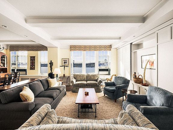 The Apartment: The apartment combines the graciousness of a prewar layout with modern design beginning with a generously scaled foyer and adjacent walk-in coat closet that has direct access to the family room / den that can also be used as a formal dining room, directly off which is a separate windowed office perfect for working from home. The apartment continues into the great room that measures twenty-two feet by thirty-one feet that is flooded in light through the ganged west facing windows that has ample space for both dining and living as well as custom built-ins and has a powder room and closet directly off it. The windowed kitchen provides a rarity for NYC living with commodious amounts of cabinet and counter space, two pantries, a wine cooler, a breakfast bar for gathering, and an appliance package including a Viking stainless range, a 36” Subzero refrigerator, a Miele dishwasher and Maytag washer and dryer: with the added convenience of a secondary entrance to the service hall. The prewar layout continues with the bedroom wing that includes the primary bedroom with west facing views over the Hudson River, an en-suite windowed bathroom, and a walk-in closet. There are two generously scaled additional bedrooms with notable storage space, that are adjacent to a windowed bathroom. The care and thought that has gone into the apartment are evident by the handsome herringbone floors, custom millwork, and the generously scaled nine-foot ceiling. Additional features include a Russ sound system.