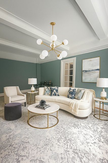 The spacious living room features beamed ceilings, an airy layout with space for multiple seating areas, and is flooded with natural light from open corner exposures. A charming French door separates the living space from the bedroom wing, enhancing the home's sense of flow and privacy.