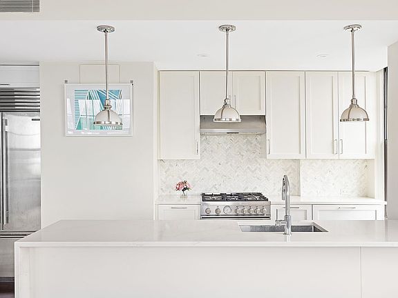 The elegant foyer of this mint combination leads to a loft-like living and dining area with sweeping park and river views. The sleek windowed kitchen has Carrara marble countertops with a waterfall edge, Calcutta Gold backsplash, and top-of-the-line appliances, including a Bertazzoni Stove and a Sub-Zero fridge.