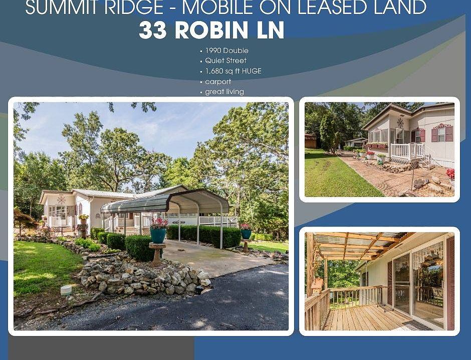 Welcome Home to 33 Robin Lane | Forsyth, MO Located at the end of a quiet street in the peaceful Summit Ridge community, this charming 1990 double-wide offers 1,680 square feet of comfortable living space-plenty of room to spread out and enjoy and well cared for. Inside, you'll find spacious bedrooms, generous closets, a large pantry, and dedicated hobby or flex rooms perfect for crafting, working from home, or simply relaxing. The home also features multiple outdoor living areas including a front deck, back deck, covered front porch, and side porch-ideal for enjoying the beautifully landscaped yard and peaceful surroundings. The carport offers convenient covered parking, and the large outbuilding provides even more storage or workshop space. The expansive backyard feels like your own private park, perfect for gardening, pets, or just unwinding in nature. Lot rent is $504/month that includes--water, sewer, trash, road maintenance, common areas. Cash offers preferred. If you're looking for quiet, space, and comfort, 33 Robin Lane is the perfect place to call home.