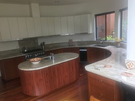 5 Bedroom/4Bath Unique KENTFIELD Home. This is a one of a kind quality, Redwood home with 32 Skylights plus dramatic foyer entrance with 40' ceiling and plexiglass pyramid skylight. Home is on a private, 12,000 sq. ft. (approx.) level lot surrounded by mature trees with a swimming pool and built in Spa as well as a large BBQ w/sink & cabinet area. There is an automatic gated fence with long driveway for playing or extra parking. Front area has beautiful courtyard. There are 2 steps to enter house from either garage or front door.1st Floor has one bedroom(or office) with full bathroom and separate entrance.4 more bedrooms with large balconies on 2nd Floor with 3 full baths. Large Master Bedroom with vaulted ceiling, great view of Mt. Tam, large walk-in closet and recently remodeled master bath area with 2 extra large rain shower heads and large oval shaped tub. Various shades of green glass tiles surround this bathroom. House is a short distance from bike/walk path, Bacich School, Kent Middle School and College of Marin. It is close to SF Bus stop and approx. 1 1/2 miles from Larkspur Ferry and HIghway 101.Kitchen is oval shaped w/48" Sub-Zero Refrig, Miele Dishwasher, 36" professional Thermador oven w/6 burners and recently renovated quartz countertops. Both Family Room and Living room have sliding doors to backyard decks. Sunken Living Room w/spectacular fireplace.Separate washer/dryer room. Separate Dining room or can be used as an office. Separate large wine cellar.