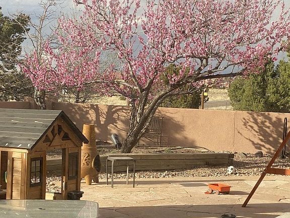 5 bedroom 3 bath spacious home at the end of a cul de sac. Prolific peach tree, lilac tree, apple tree and crab apple tree in enclosed backyard. Flagstone laid in back yard in 2021. Solar on roof. Tile flooring and carpet in 3 bedrooms installed in 2020. High ceilings with exposed beams. Radiant heat installed in the floor. 2 evaporative coolers just serviced. Split units in sunny dining room and primary bedroom for additional cooling and heating options. Double oven, instant hot water spout, gas range, etc in kitchen. The 5th bedroom can serve as a great guest space with attached bathroom, sliding door and patio area. Two car garage. Rancho Viejo trail adjacent. Lovely, neighborhood close to Santa Fe Community College, Amy Biehl Elementary School, IAIA and more.