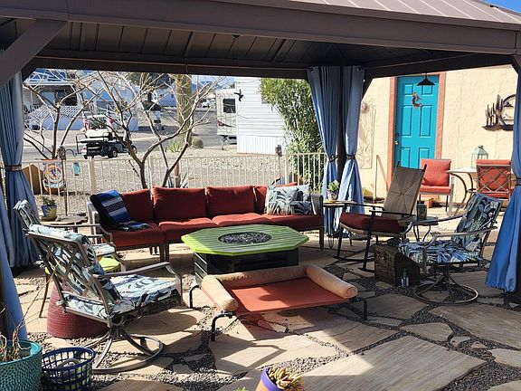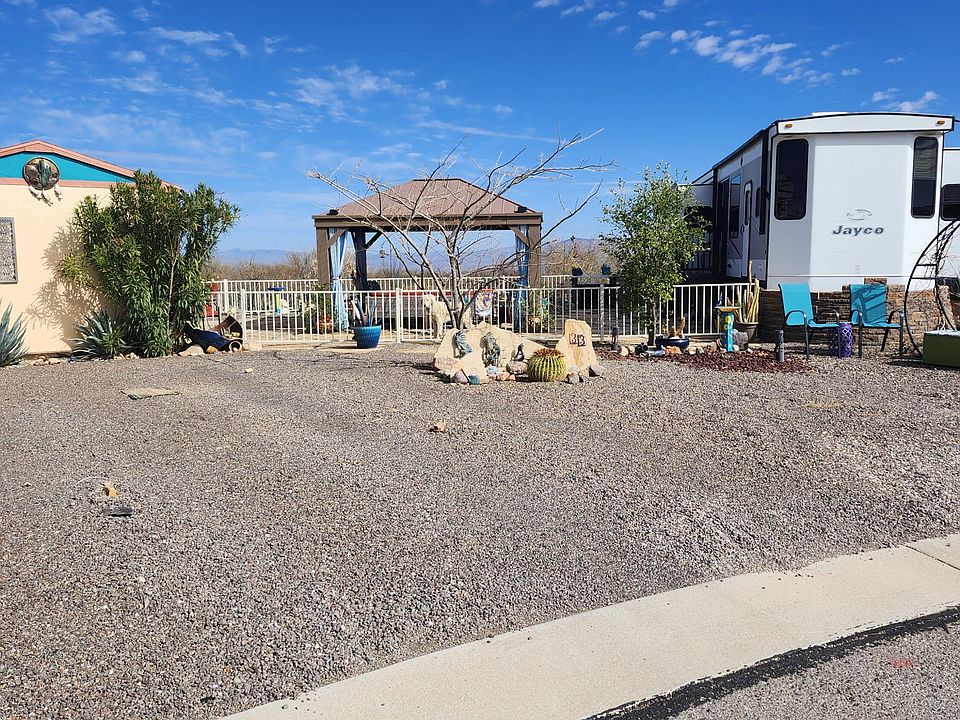 This spacious 4662 sq ft (90 x 70') lot is fully landscaped with a fenced in flagstonepatio & 14 x 12' gazebo.The RV lot is located in the LOA 55+ gated section of Cochise Terrace. The mountain views from the comfort of the gazebo are breathtaking! The fabulous sunrises/sunsets, wildlife, desert flora, and even Benson 4 th of July fireworks are all viewable as you relax with your morning coffee or favorite evening beverage. This property also boasts a finished 20 x 12' shed. The main room, remodeled in2023, is fully insulated with a fireplace, AC & another washer & dryer hook-up. The opportunities for this space is unlimited - perhaps a workshop, craft area or media room - the choice is all yours! The shed also includes a large interior storage closet.See agent remarks also