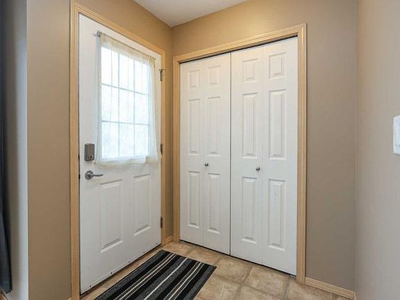South facing patioCovered front entryWelcoming foyerGenerous size coat closetBlack appliancesDining areaFinished storage space