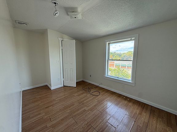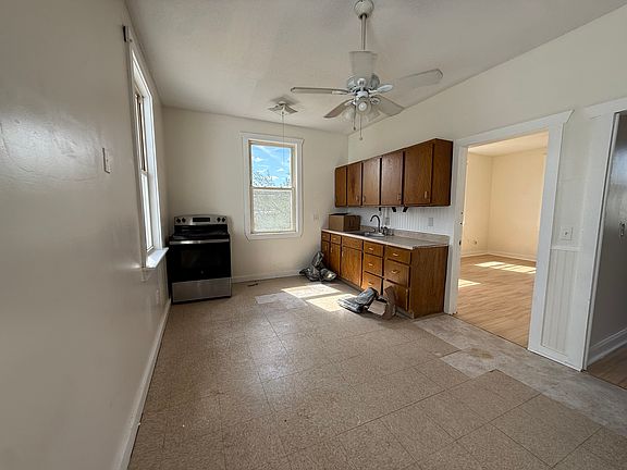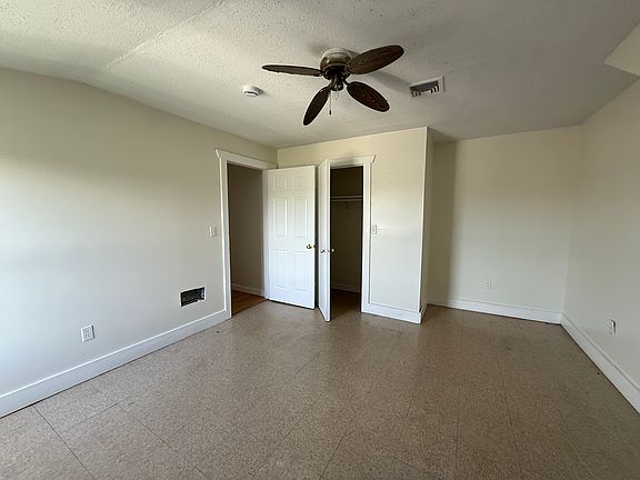 Inside, the living spaces appear freshly painted and are ready for a new occupant. The rooms are bright and feature large windows that fill the space with natural light. Most of the floors are a light-toned, wood-look laminate, though some rooms have a checkered linoleum. The bedrooms are equipped with ceiling fans and ample closet space. The kitchen has wood cabinetry, a stainless steel stove, and a sink. The bathroom is complete with a tub, a toilet, a vanity with a sink, and a mirrored cabinet. The property has a clean and simple aesthetic, making it an ideal, move-in-ready home.