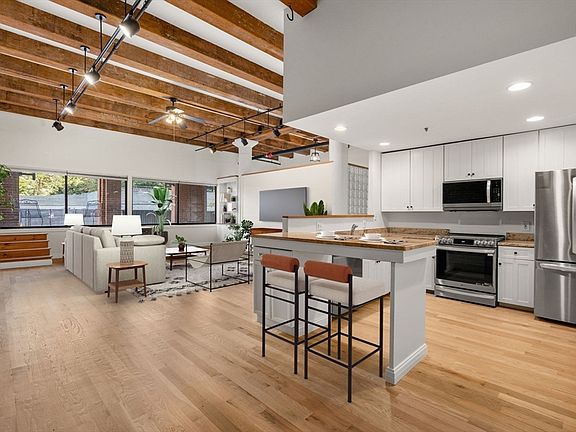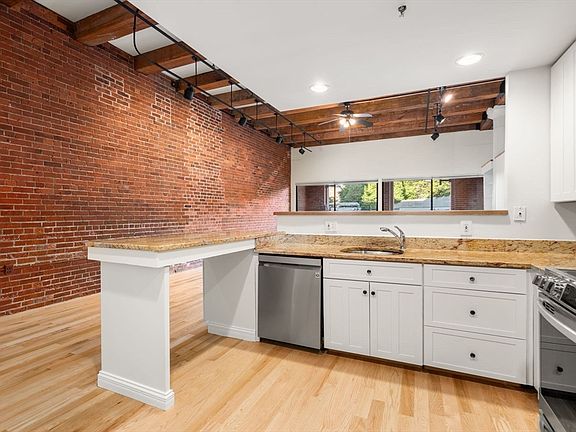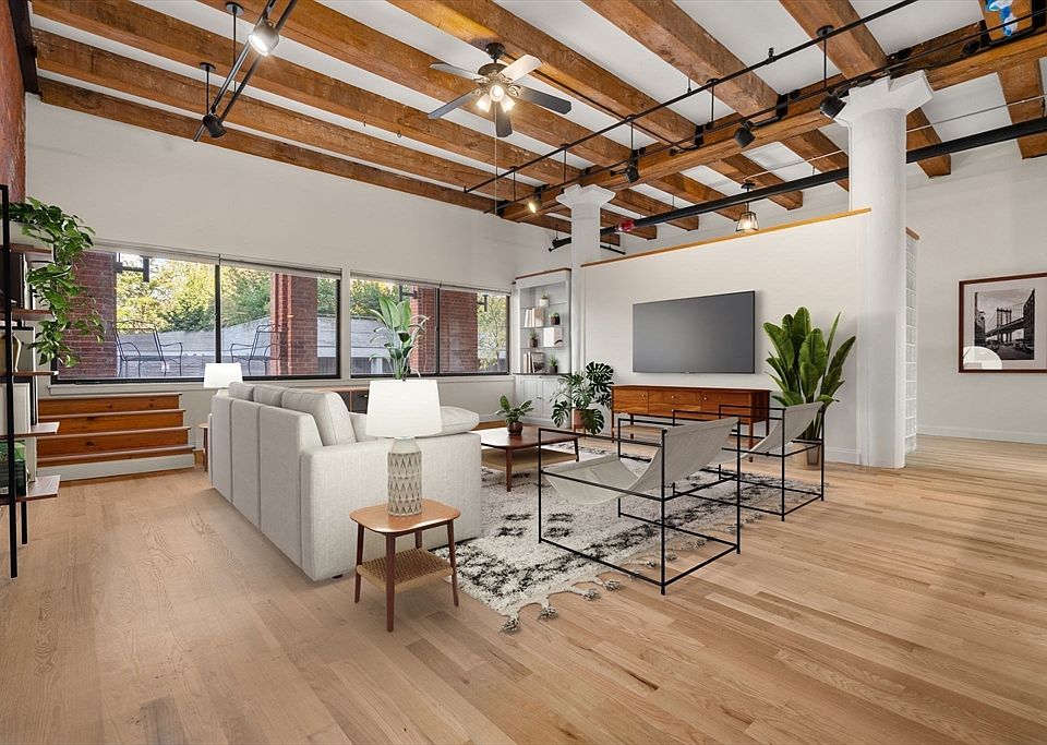 Glass-enclosed showerSpa-like bathBreakfast barHardwood floorsNew upscale kitchenDramatic brick-and-beam constructionSerene bedroom suite