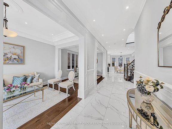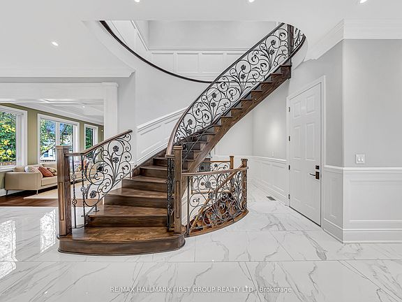 Exquisite custom-built luxury home in Scarborough's prestigious Highland Creek community. This 4+1 bedroom, 7-bath residence features a bright, open-concept layout with 10-ft main-level ceilings, rich hardwood floors, custom wainscoting on all floors, and expansive windows. The second floor boasts 9-ft ceilings with tray accents.Each bedroom includes a private ensuite and walk-in closet, with one offering a Juliet balcony. The gourmet kitchen showcases premium stainless steel appliances, a built-in oven, and custom cabinetry. A curved oak staircase with handcrafted iron railings, LED accent lighting, pot lights, coffered ceilings, and a gas fireplace adds elegance throughout.Upstairs laundry, professionally designed décor, and $20K in Hunter Douglas window coverings enhance sophistication. The high-ceiling basement provides versatile space, and the landscaped yard features an automated sprinkler system.Walking distance to top schools and minutes to GO Station and Highway 401-luxury and convenience combined in one exceptional home.A truly one-of-a-kind home!