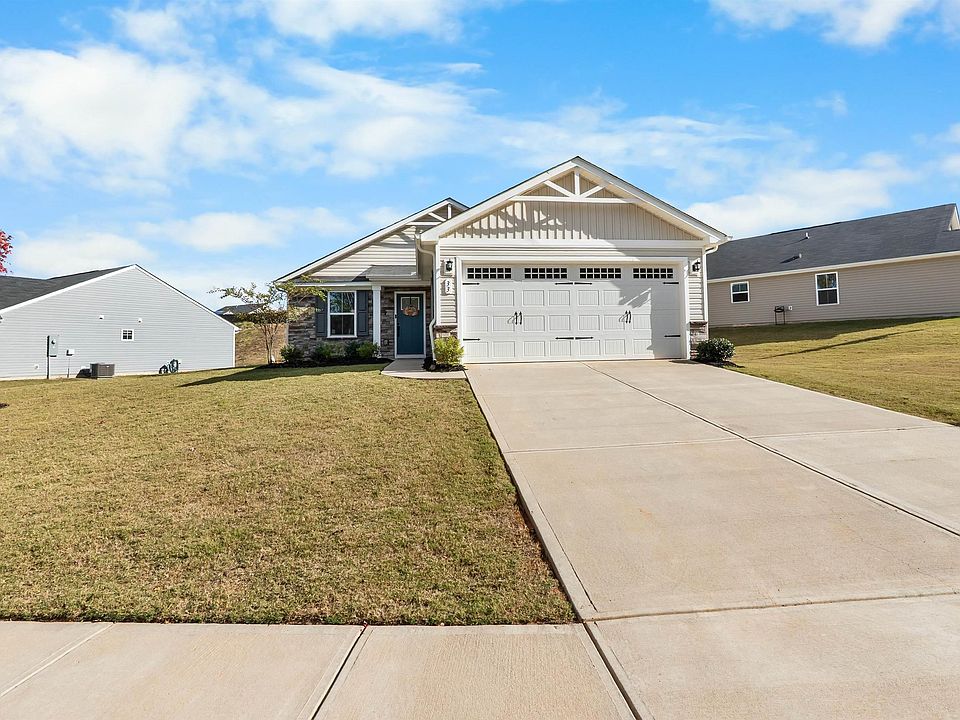 Just two years old, this home in Woodland Pointe is better than new and offers a beautiful 2-bedroom, 2-bathroom open floor plan with screened porch in the rear and 2-car attached garage. From the entry way, pass the dining room to the left on your way to the kitchen. Granite counters and a granite-topped island, as well as luxury vinyl plank flooring, accent the stainless steel appliances. (The refrigerator is included in the sale.) The custom island provides seating for meals and snacks and extra storage. The cozy living room offers after-dinner seating, as well as sliding door access to the screened patio and level back yard. The primary suite sits at the rear of the home for privacy and includes a brushed nickel-accented full bathroom, featuring a tiled shower. A large walk-in closet offers plentiful storage for clothes and more. You will find the laundry room just off the hallway leading from the primary suite. (Washer and dryer are included in the sale.) The second bedroom and full bathroom are near the front of the home, just off the entry hall. Outside, the sodded yard—with full irrigation system—gently slopes away from the home and could be fenced in with HOA approval. This suburban location is less than one mile from the newly opened Publix supermarket at the Shops at Arden Woods. Easy access to I-185 and downtown Greenville is also nearby.
