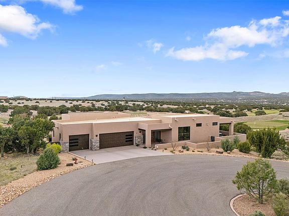 Accepting backup offers. Nestled in the prestigious Las Campanas gated community, this nearly new home offers breathtaking sunset & golf course views. Meticulously upgraded by the discerning owners, this residence boasts superior craftsmanship & thoughtful design.  Energy efficient with Anderson 400 series windows & the convenience of an oversized, climate-controlled three car garage (Pre-wired for EV charger). The open concept floor plan flows seamlessly from the gourmet kitchen, featuring undermount lighting, quartz countertops with waterfall edge, Viking appliances, & a walk-in pantry, to the expansive dining & living areas. Imagine cozy evenings by the contemporary gas fireplace with its striking stacked stone wall, surrounded by large sliders leading to multiple outdoor living spaces. Electric Hunter Douglas shades in the living & dining rooms, while a built-in Sonos sound system enhances the ambiance in the living room, primary bedroom, & patio. Retreat to the primary bedroom, a sanctuary of relaxation with its private portal offering million dollar sunset & golf course vistas. The luxurious primary bath features a curbless walk-in shower, soaking tub, dual sinks & walk-in closet. A convenient access door leads from the primary closet to the laundry room, complete with a utility sink, custom cabinetry, and Electrolux washer/dryer. The secondary bedrooms are on a separate wing for enhanced privacy & floating vanities add a touch of modern elegance to the half bath and guest bath. The large third bedroom & guest bath may be closed off for added quietness. Soft-close drawers & cabinets throughout the entire home - custom-built closet systems in all three bedrooms. Security system w/ 6 cameras. Enjoy the outdoors with four distinct living spaces, including one at the front & three at the rear, showcasing direct views of the Jemez Mountains, stunning western sunsets, & golf course. Situated on the largest lot on the street, this home offers unparalleled privacy.