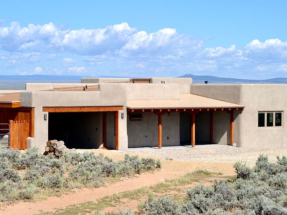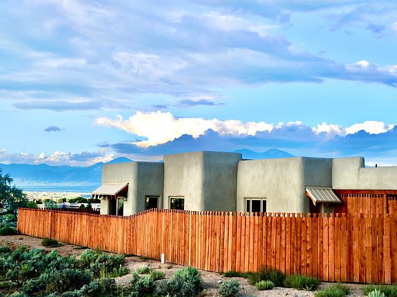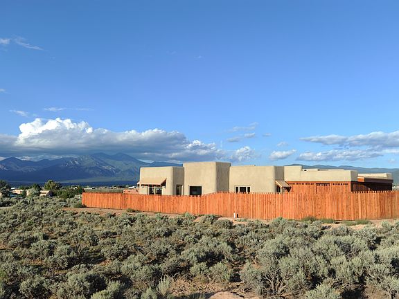 This is a remarkable custom home built in 2025 by renowned local builder Douglas Custom Homes. This property is situated on a hill adjacent to Taos Country Club with 360 degree panoramic views, sitting on 1.25 acres. Amenities include: 36" deep foundation (24" is norm.). 6 mil black plastic with 2" sub grade foam insulation = frost and radon barrier. 2x8 construction. R 43 insulated walls. R 60 insulated ceilings. Draw knifed "vigas" throughout. 16" x 32" Italian Porcelain throughout. Hard trowel plaster finish throughout. Sierra Pacific Designer low E double pane windows. LG 5 burner gas stove with pot filler. LG "side by side" 36" refrigerator. Nivean "on demand" domestic and radiant heating. Crack isolation / radon barrier underlayment for tile. 42" under counter stainless kitchen sink. enclosed fenced yard. 2 car carport, prepped for potential enclosure. piñon trees on property. 45 minute drive to world renown Taos Ski Valley. 2 minutes to Taos Country Club golf course. 2 hr. 45 min. to ABQ Int'l airport. 10 min. from Taos Plaza. Single track mtn. biking along The Rio Grande Gorge, 5 min. away. Unobstructed scenic views abound, Must see Property!! Incredibly built!