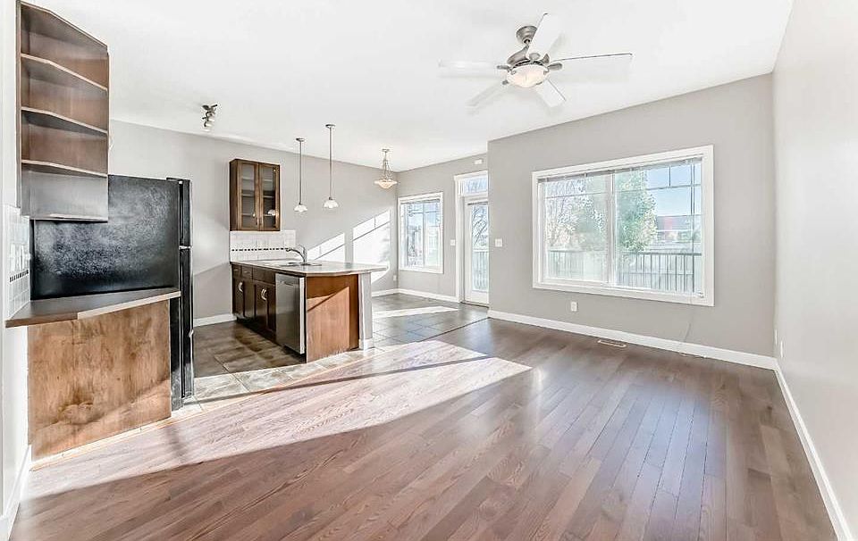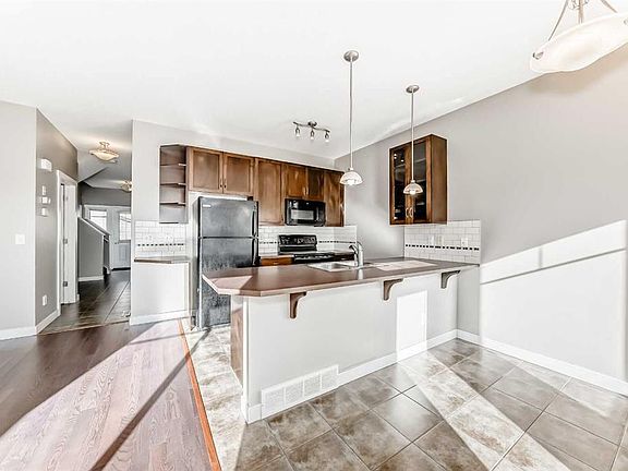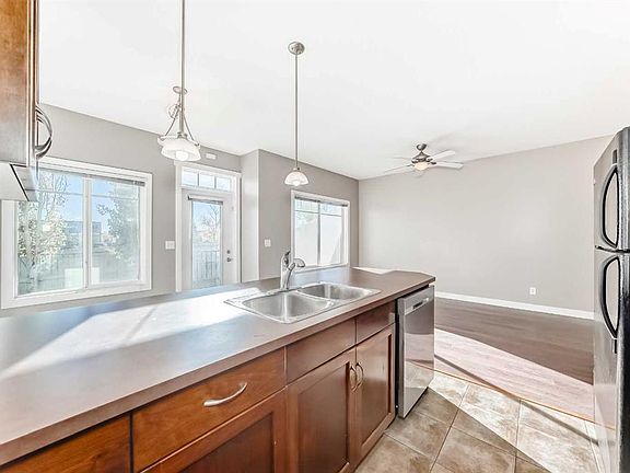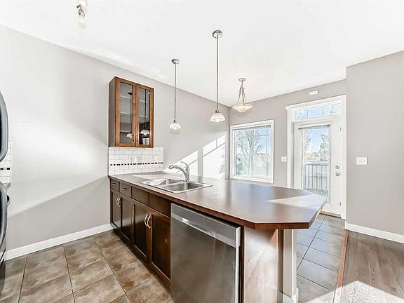 Amazing location — walk to Costco, GoodLife, Home Depot, Winners, schools, restaurants, and scenic walking paths, with easy highway access! This FRESHLY PAINTED this townhouse features NEW FLOORING throughout. The bright, open-concept main floor offers a spacious living room, kitchen with eating bar, dining area, and a convenient 2-piece bath. Step out to the east-facing deck with a gas BBQ hookup, perfect for morning coffee or evening relaxation. Upstairs includes a large primary bedroom with walk-in closet and 4-piece ensuite, plus two additional bedrooms, upper laundry, and a 4-piece main bath. The undeveloped basement has a bathroom rough-in and room to grow. Complete with an oversized single attached garage, driveway parking, and visitor stalls nearby, this home is perfect for first-time buyers or downsizers alike!
