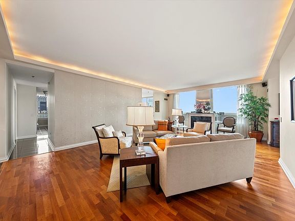 Breathtaking City & Lake Views from Every Window! This expansive 2,700 sq ft corner residence combines dramatic views with sophisticated design for modern city living. The light-filled, open-concept layout is ideal for both everyday comfort and effortless entertaining. The chef's kitchen is a true showpiece with a large center island, sleek stone counters, and top-tier Sub-Zero & Bosch appliances. Living spaces are elevated with walls of windows, hardwood floors, and refined custom upgrades-wet bar, three fireplaces, motorized shades, UV-protected windows, tray ceiling lighting, and integrated surround sound. Retreat to the spacious primary suite featuring a spa-inspired bath with soaking tub and glass-enclosed shower, plus multiple custom California Closets for exceptional storage. A dedicated laundry room with side-by-side washer/dryer and built-in cabinetry adds convenience. Residents enjoy a full-service lifestyle with 24-hour door staff, fitness center, party and conference rooms, outdoor pool, and prime garage parking space P 10 C26 included.