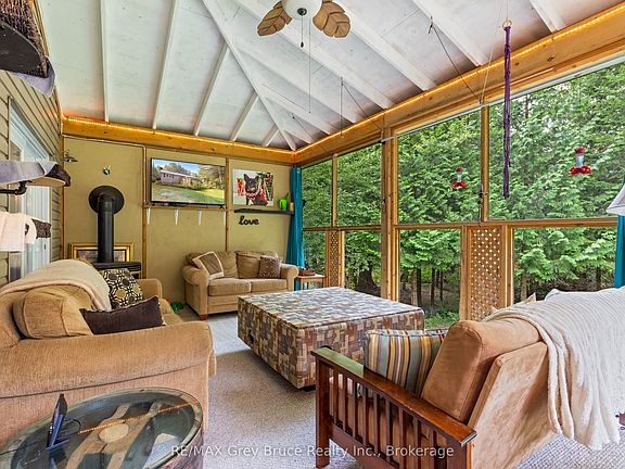 PARADISE FOUND! Welcome to your private retreat nestled on a serene 2-acre lot at the end of a quiet dead-end road. Surrounded by mature trees this property is the perfect escape from city life and even offers potential for a home-based business. One of the standout features is the impressive 30' x 40' heated and insulated garage/workshop a dream space for hobbyists, mechanics, or entrepreneurs. It includes its own laundry, an outdoor shower, floor drain, drive-through doors, and a large 10' high by 12' wide automatic bay door. Additional storage is no issue with a 9' x 40' lean-to and a detached shed. You'll love the greenhouse with its own propane furnace and water hookup. Coupled with the raised garden beds, garden area, and fruit trees, you could have home-grown food galore! Inside, the home offers over 1,600+ sq. ft. of comfortable living space, plus a 294 sq.ft. 3-season sunroom featuring a fireplace and TV, perfect for bug-free relaxation or entertaining. The spacious kitchen is equipped with solid cherry cabinets, a large island, and an integrated office nook. Just off the kitchen is a bright, open-concept living and dining area, centered around one of the homes three propane fireplaces. The primary bedroom offers direct access to the sunroom, a walk-in closet, its own fireplace, and a luxurious jacuzzi tub. Quality finishes run throughout the home, including solid oak doors and trim, hardwood flooring, central air, propane furnace, and central vac. A partial-height basement adds additional storage and features a woodstove to keep things cozy. Located just a short drive from Lion's Head for all your amenities, and minutes from Black Creek Provincial Park and its sandy beach for family enjoyment on warm summer days or watching beautiful sunsets. If you're dreaming of a move to the country with flexible, functional outbuildings and peaceful surroundings this property could be the perfect fit!