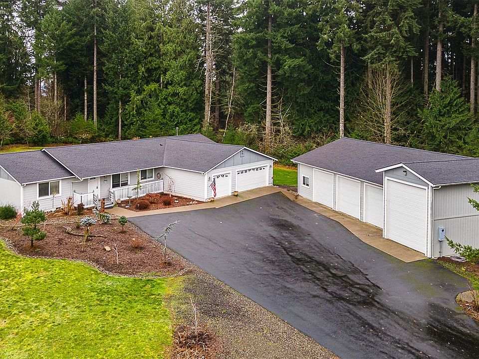 Need a house with your shop? Along with a 36'x 46' (4) bay shop with one 14'x44' bay, an extra storage room, and half bath is a spacious rambler in a super desirable neighborhood and school district. Both the home and the shop have received a new roof, the heat pump was just upgraded in September, plus upgraded curb appeal with new rock and attractive landscaping. Newer appliances, walnut floors, hickory cabinets, granite counters, pantry, in the kitchen that's open to the living room and dining area. Large primary bedroom with walk in closet on one end and additional bedrooms and family room with woodstove at the other. Private back deck with hot tub! Attached garage has extra hobby room/office. RV hook up, paved drive, and wood shed.