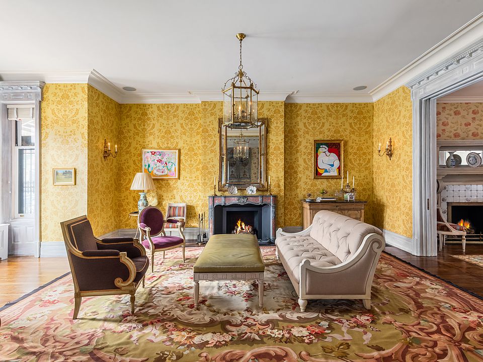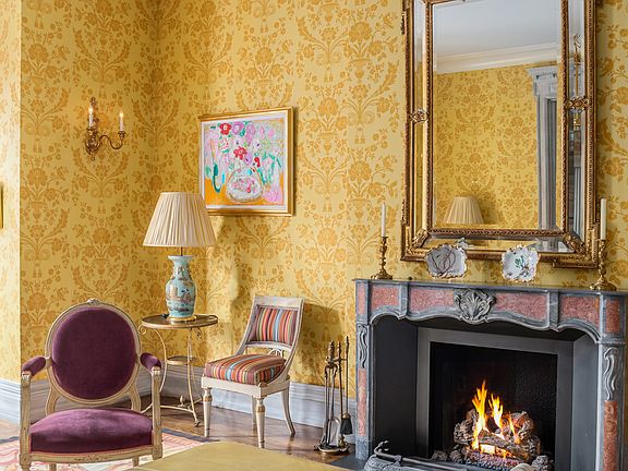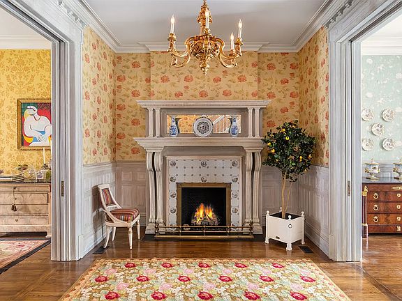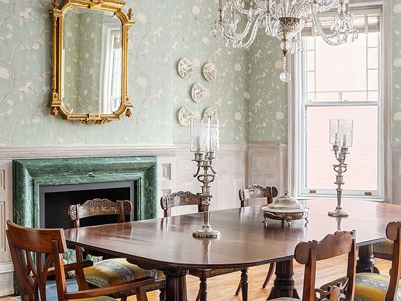 The parlor floor welcomes you through a striking houndstooth marble foyer, unfolding into a series of grand, light-filled rooms. The Great Room features oversized windows, an antique French carved mantel, and original pocket doors that open into a central hall adorned with a Victorian-era carved wood mantel. The west-facing formal dining room, large enough to seat 20 guests, boasts a bolection marble fireplace and serene views of the gardenideal for entertaining. A stylish powder room and a dramatic skylit staircase complete this level.