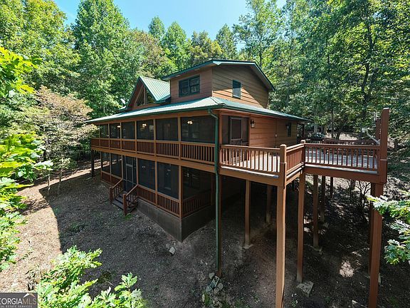 Creekfront Cabin-Style Retreat - Perfect for Full-Time Living or Vacation Rental! This charming quality-built 3 bedroom, 3 bathroom cabin-style home offers the perfect blend of rustic charm and modern comfort, making it an ideal private retreat or a fantastic investment opportunity. Nestled in a serene, secluded setting yet conveniently close to shopping, this property provides the best of both worlds. Step inside to an open-concept living room with soaring cathedral ceilings and a striking rock gas fireplace, creating a warm and inviting atmosphere. The kitchen is a chef's dream, featuring a granite-topped island, ample cabinetry, and included appliances. On the main level, you'll find a master suite with a spa-like bathroom complete with heated floors, a step-in shower, and a walk-in closet. Another master suite upstairs offers a private bath with double sinks and its own walk-in closet. The upper level also includes a spacious open loft area-perfect for a home office, playroom, or additional living space. The walkout basement expands the living area with a bedroom, full bath, game room or living area, and a large screened-in porch overlooking the creek. A sizable storage room with a utility sink provides plenty of functionality. Enjoy the outdoors on the expansive wraparound deck, designed with open grilling areas, a wired and supported space for a hot tub, and peaceful views of the creek. Enjoy evening gatherings with friends and family around the large fire pit area. Store your tools and toys in the 14x16 double-door storage shed. The asphalt driveway, low-maintenance yard, and timeless wood-sided cabin exterior add to the property's appeal. With two master suites, multiple living areas, and thoughtful details throughout, this home is a versatile, turnkey retreat ready to be enjoyed or shared as a vacation rental.
