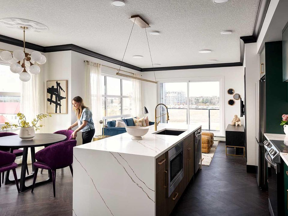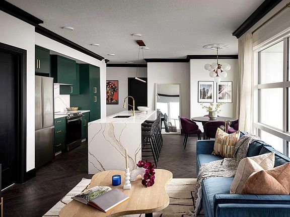 Discover the "Argento" floorplan by award-winning Rohit Homes—a bright and spacious 2-bedroom, 2-bathroom corner unit thoughtfully designed for comfort and style. Perfectly situated on the 5th floor of Quesnay at Currie Barracks, this home boasts soaring 9' ceilings that create an airy, open feel while large windows fill the space with natural light. Featuring the bold and stylish Haute Contemporary color palette, the interior showcases a modern edge with sleek finishes and striking contrasts. The Argento offers high-end details throughout, including quartz countertops with a waterfall edge, a matching quartz backsplash, full-height cabinetry, a premium appliance package, bespoke light fixtures, and designer window coverings. The open-concept layout flows seamlessly between the kitchen, dining, and living areas, ideal for entertaining or simply enjoying everyday life. The primary suite includes a private ensuite for a touch of luxury, while the second bedroom and additional full bath provide comfort and flexibility for guests or a home office. Step outside to your ground-floor patio, extending your living space and offering a convenient connection to the outdoors. This pet-friendly and AIRBNB-approved building includes titled heated underground parking and plenty of visitor spaces. With its unbeatable location just minutes from downtown, Mount Royal University, and the vibrant communities of 17th Ave and Marda Loop, the Argento floorplan is perfect for downsizers or anyone looking for a stylish, low-maintenance home. Limited units are available—don't miss your chance to make this striking residence yours! **Photos are taken from existing building of the same models. Not of the exact unit **