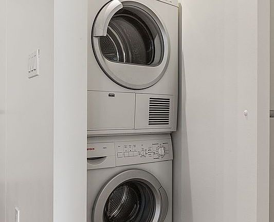 The king-size bedroom offers double exposure, custom closets, and serene sky views, while the modern bath includes a soaking tub and rain shower. Additional highlights include in-unit washer/dryer, wide-plank oak floors, high ceilings, and oversized windows.