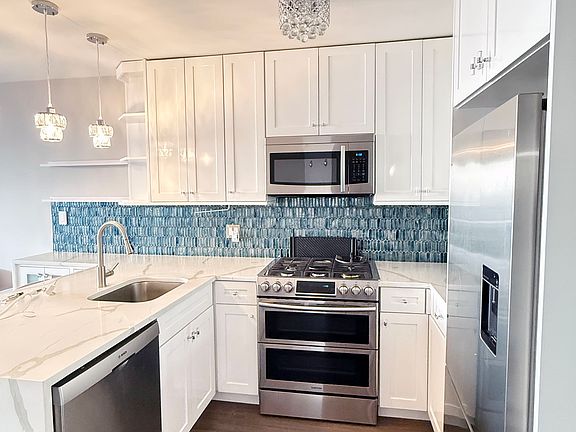 Renovated Kitchen: Outfitted with sleek white cabinetry, quartz countertops, high-end stainless steel appliances, and a striking tile backsplash. The breakfast bar adds functionality and creates a perfect transition to the living space.