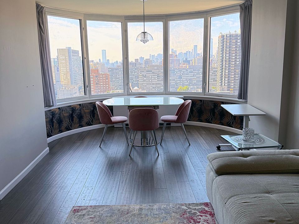 Spacious Living & Dining: A grand living room flows into a curved dining alcove framed by dramatic floor-to-ceiling bay windows, bathing the space in natural light and showcasing sweeping views of the Manhattan skyline. A private balcony extends the living area outdoors.