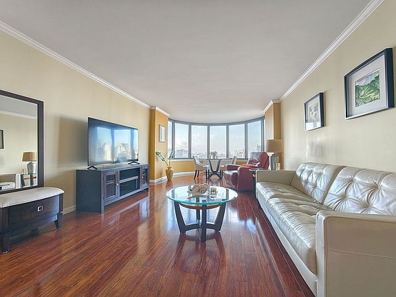 Perched high on the 32nd floor of the renowned Corinthian Condominium, this stunning 1-bedroom, 1-bath residence offers panoramic views of the  Manhattan skyline through its signature curved bay windows. Sunlight floods the spacious living and dining area, creating a bright and airy ambiance ideal for both relaxing and entertaining.
