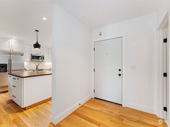 Come see this elegant fully remodeled condo located steps away from walking trails, shopping, local dining, and other great venues. New electrical, plumbing, 3/4" wide plank white oak solid hardwood flooring throughout accompanied with new tile in bathroom and laundry room. Gourmet kitchen includes custom cabinets w/ black walnut island countertops, granite countertops, and a full Samsung appliance suite. Hand-troweled walls t/out. Milgard wood windows and sliding doors come with a warranty. Exterior glass light door from bedroom to balcony. Storage unit right under condo. No walking in the rain! Peekaboo views of Mt. Rainier, Pudget Sound, and Cascades from the balcony. Close to farmer's market, Performing Arts Center, & the Seattle Ferry!