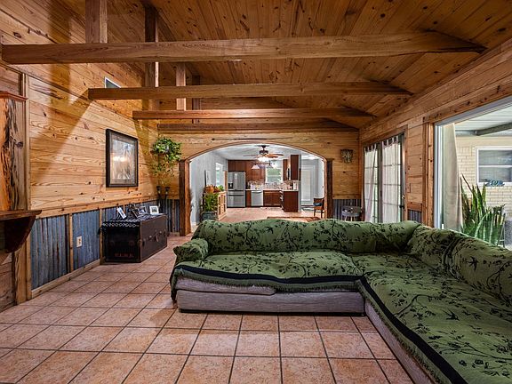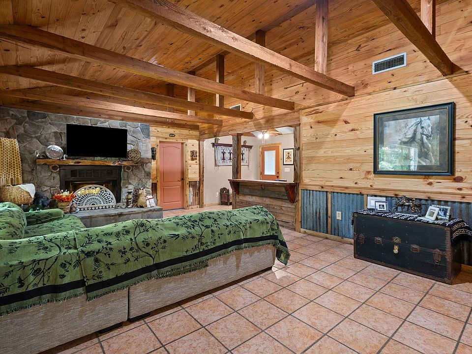 Rustic-Modern Charmer! A One-of-a-kind home featuring a grand arch with columns made of pecky cypress leading into an open-concept kitchen and living area. The living room exudes rural elegance with exposed western cedar beam ceiling, a striking stone wood burning fireplace (w blower & outdoor log rack), picture windows viewing tree-shaded grounds and cedar wet bar area also with cypress columns. The primary suite has a walk-in closet and free standing cast-iron tub with separate shower. Throughout you’ll find ceramic luxury tile and newer carpet in bedrooms. A tip-out bay window in the dining room, mudroom off garage and lg laundry with flex space add function. Nature lovers will enjoy privacy with a large spacious covered patio, a fire pit area, plus a large storage building. The garage includes workspace, storage, and barn-door access to a 2nd covered patio with locally milled wood posts, perfect for BBQs. Add the circular driveway & all of which makes this a dream for entertaining!