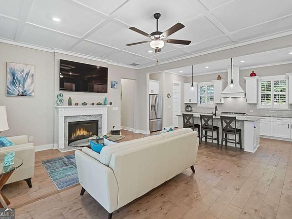 This stunning modern farmhouse is better than new, thoughtfully upgraded, and perfectly set on over 2 acres in the exclusive gated Tate Reserve community of Ball Ground. From the moment you step inside, soaring 10-foot ceilings, 8-foot doors, and expansive windows create a bright, open feel that highlights the home's custom details. The spacious great room, anchored by a striking fireplace, flows effortlessly into the chef's kitchen-complete with 42-inch soft-close cabinetry, gleaming granite countertops, stainless steel appliances, a 5-burner gas cooktop, upgraded hood vent, and a generous island designed for gathering. The main-level owner's suite is a private retreat, featuring a spa-like bath with a frameless walk-in shower, soaking tub, double vanity with granite counters, and an oversized walk-in closet. Two secondary bedrooms on the main level share a full bath, while the finished terrace level presents the perfect in-law suite setup. This expansive area includes a spacious living room, a kitchenette with an eat-in island, an open dining area, a full bath with a tiled walk-in shower, and two additional bedrooms-one of which is currently used as an office. Outdoor living shines with a covered back porch overlooking the grassed and fenced backyard and a lower-level patio that's perfect for entertaining or quiet evenings surrounded by nature. A side entry 2 garage, mudroom with drop zone, and professional landscaping complete this extraordinary home. Blending modern design, functionality, and timeless charm, this home offers the very best of North Georgia living in a secure, gated setting-just minutes from downtown Ball Ground, Canton, and GA-575.