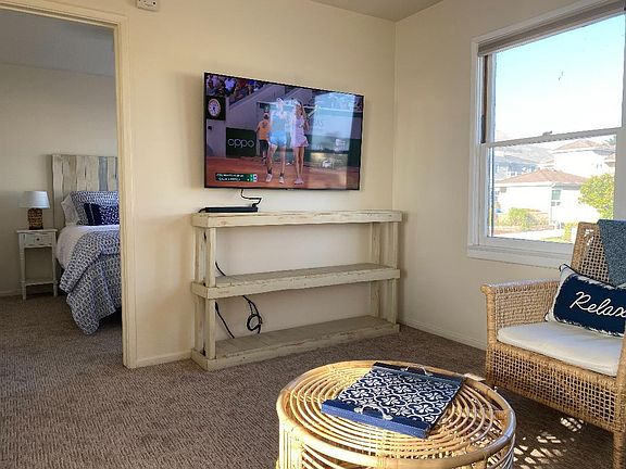 This upstairs 1BR unit feels which feels like you're in a bird's perch, with views out of every room. From the kitchen, you have views of the Pacific Ocean; in the family room and bedroom are 2 large windows in each room providing amazing views of the hillsides and a glimpse of the ocean. The unit is freshly painted and has new furniture throughout (new queen sized bed and headboard, side tables, 55" tv, microwave, etc.) and decorated with an artist's touch! Renter has access to a firepit and Adirondack chairs in the front-yard (with views of the ocean), and the backyard has been renovated (new chairs & umbrella added to the rear patio and a cornhole board added). The bathroom and shower have been completely remodeled.