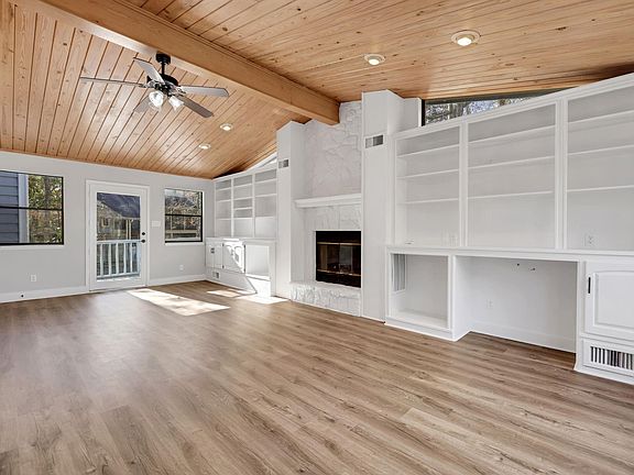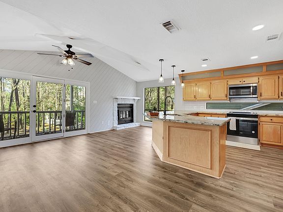 Step into the charm and character of this unique home set within the desirable Cape Royale community on Lake Livingston. This 3-bedroom, 2-bath home blends comfort, versatility, and a touch of rustic warmth. The inviting living room centers around a classic wood-burning fireplace framed by custom built-ins, while a second fireplace in the kitchen and dining area creates an ideal gathering spot for family and friends. The kitchen features granite countertops, a generous breakfast bar and abundant cabinetry for storage and organization. Upstairs the private primary suite features an ensuite with dual sinks and spacious walk-in closet. The large downstairs bedroom provides flexible use as a second living area or game room. Cape Royale residents enjoy resort-style amenities including a 24-hour manned gate, community pool, tennis courts, nature trail, and a full-service marina with a small store - everything you need for the ultimate lakeside lifestyle.