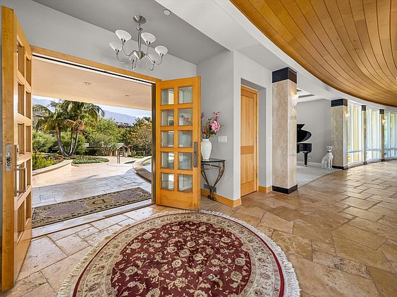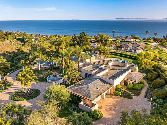 Set on 4.8 acres between Montecito and Summerland, this gated estate offers 280 views of the ocean, islands, mountains, and Santa Barbara Harbor. The 6,212 SF residence features soaring ceilings, curved architectural walls, and seamless indoor-outdoor flow. The main level includes a grand living room, formal and rotunda dining rooms, family room, open office, and 3-car garage. The primary suite boasts dual baths, fireplace, and ocean views. 2 additional guest suites complete the entry level. Outdoors, enjoy a zero-entry pool, kitchen, and fire pit. The lower level includes a second kitchen, living room, 2 more suites, and a 2nd garage. A private guest house offers a bedroom, bunk area, full kitchen, and living area. Elevator access and 5 garage spaces complete the furnished estate.