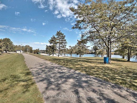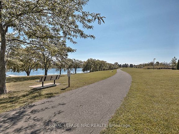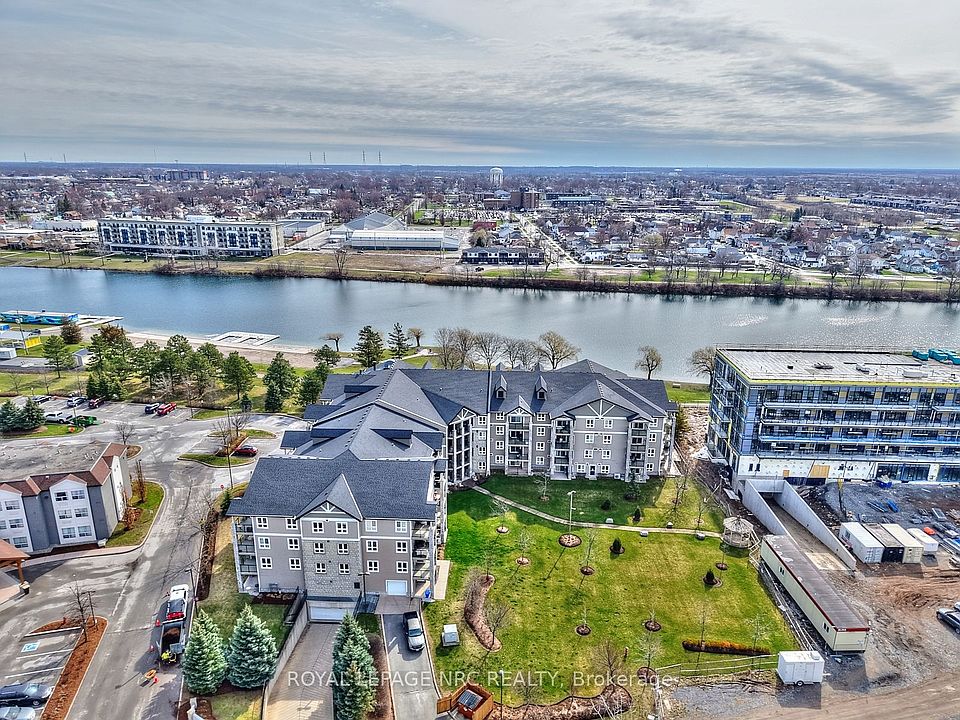 Welcome to this beautifully maintained one-bedroom + den suite in a desirable waterfront building in West Welland. Enjoy the walking trails right outside your door along the river, as well as proximity to parks, schools, and all amenities. This bright and inviting unit offers an open-concept layout featuring a spacious living and dining area seamlessly connected to a functional kitchen with a centre island-perfect for cooking and entertaining. The large primary bedroom includes a walk-in closet, while the den provides an ideal space for a home office or guest area. Enjoy your morning coffee or evening unwind on the covered balcony overlooking the serene surroundings of the waterfront and greenspace. Additional highlights include in-suite laundry, a four-piece bathroom, and newer furnace and air conditioner (both within one year). This well-maintained building includes two deeded parking spaces-one underground and one outdoor-as well as a main-floor storage locker for added convenience. The only utilities you pay are gas and hydro, with water included in the condo fees. Experience low-maintenance living in a peaceful waterfront setting-perfect for professionals, downsizers, or anyone seeking comfort and convenience in the heart of Welland.